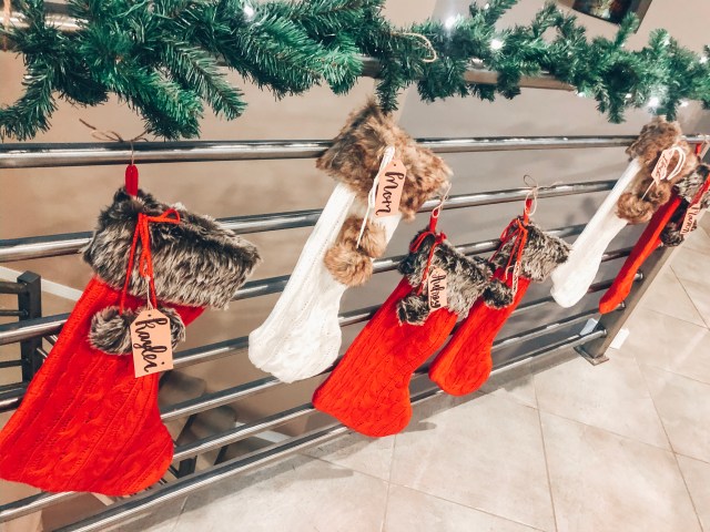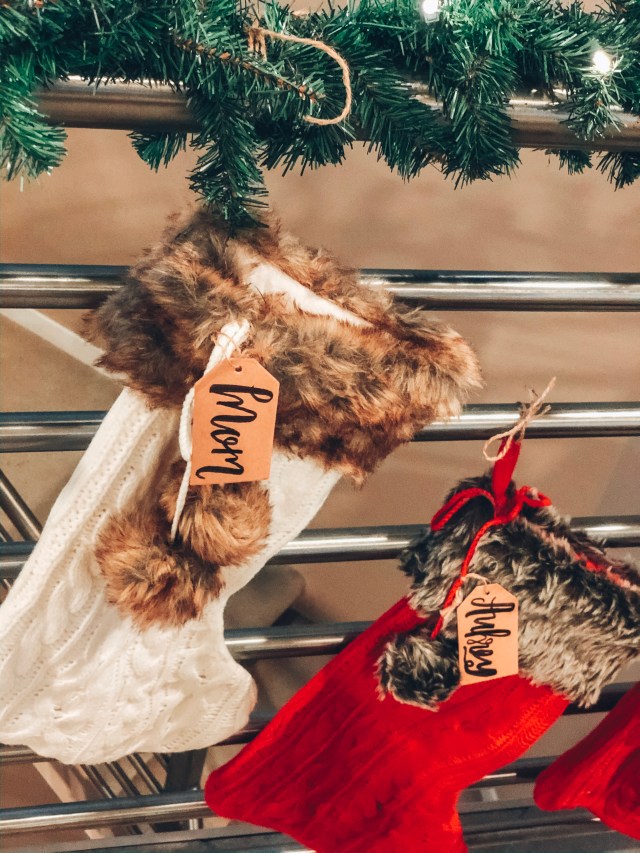 we ordered a mantle for our fireplace, but while waiting for it to get here, we had to get creative as to where to hang our stockings in the meantime. we picked up some garland and decided to hang them from our railing. we put our six up, and are considering just using the mantle to hang the two dog’s stockings once we get that up just because we liked how it turned out so much.