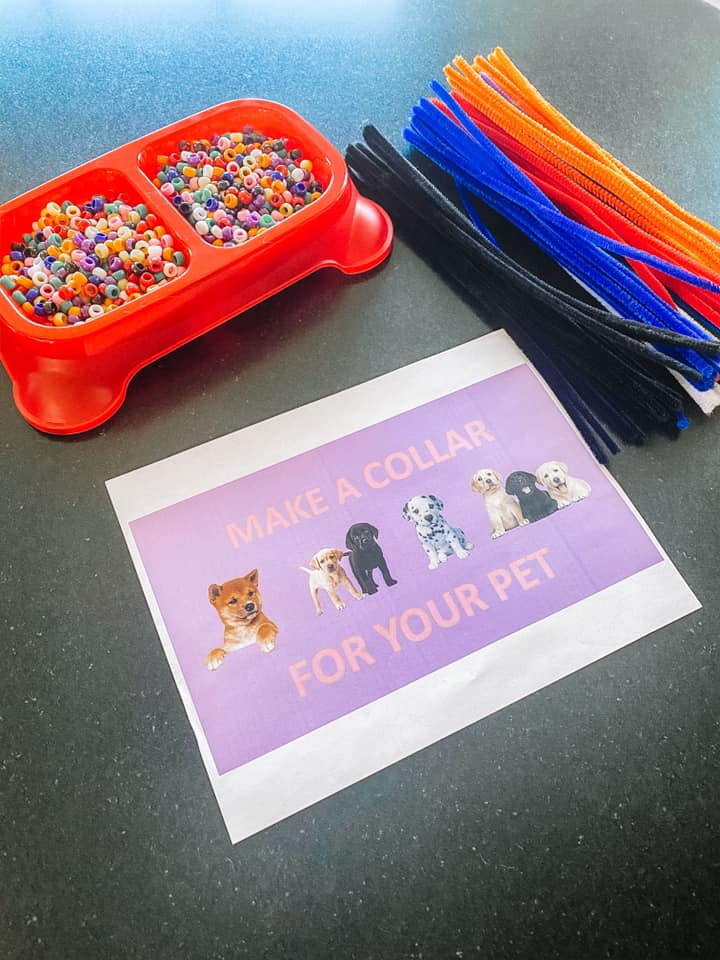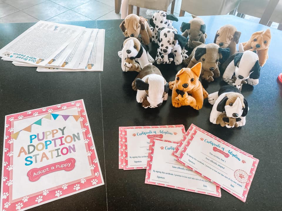 for the party gift/activity for the kids, we bought a pack of plush dogs and i made up some pet adoption certificates. the kids got to pick a dog, name and adopt them, and then create them a beaded collar. mahkena really enjoyed it and it was fun to see some of the names the kids came up with to name their dogs.
