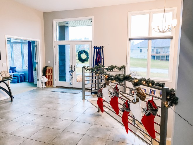 we scatter our stockings along with the dogs stockings on both our mantle and stair railing. i love adding bits of garland and twinkling lights on the railing.