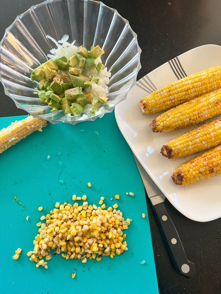 - Allow corn to cool enough before cutting it off of the cob. Combine in a large bowl the corn, diced avocado, cilantro, red onion, lime and salt and pepper.